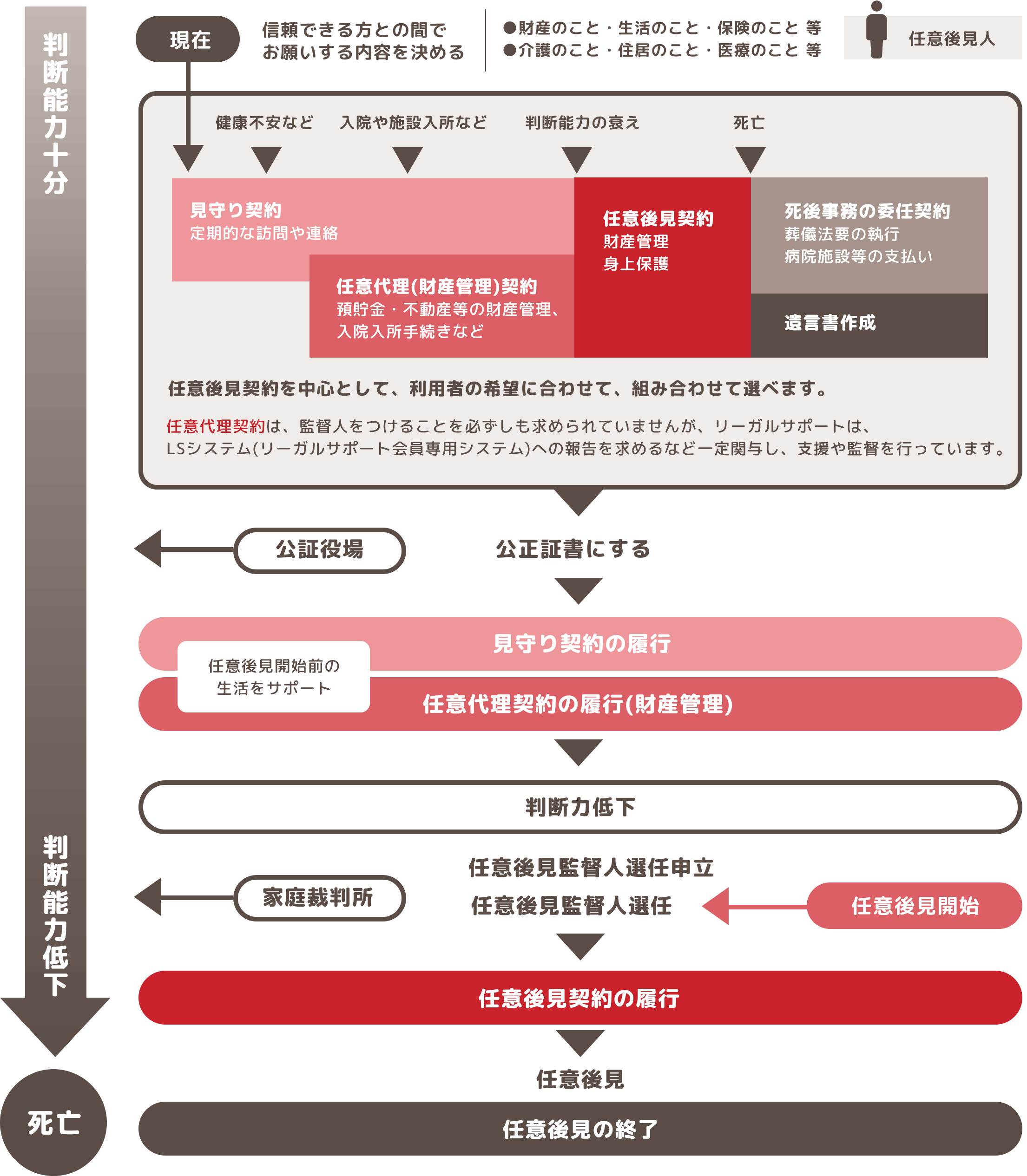 自分で決められる - 裁判所が選ぶ法定後見とは異なり、あらかじめ自分が信頼できる人(弁護士や親族など)を自由に指名できます。